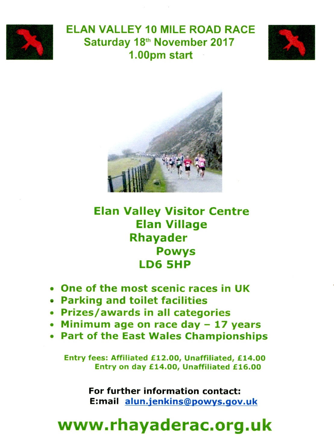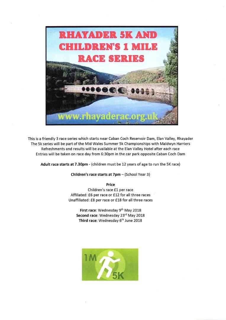 30/01/2017Round The Lakes Race, 04/03/2017Our next race will be Round The Lakes 20/5 Mile Race on 04/03/2017 30/01/2017Elan Valley 10 Mile Race ResultsResults of The Elan Valley 10 Mile Race can be downloaded from 19/10/2016Elan Valley 10 Mile Race 19/11/16Our next race will be The Elan Valley 10 Mile Race on 19/11/16 12/05/2016Results Rhayader 5K Race SeriesPlease visit www.rhayaderac.org.uk//5km.php